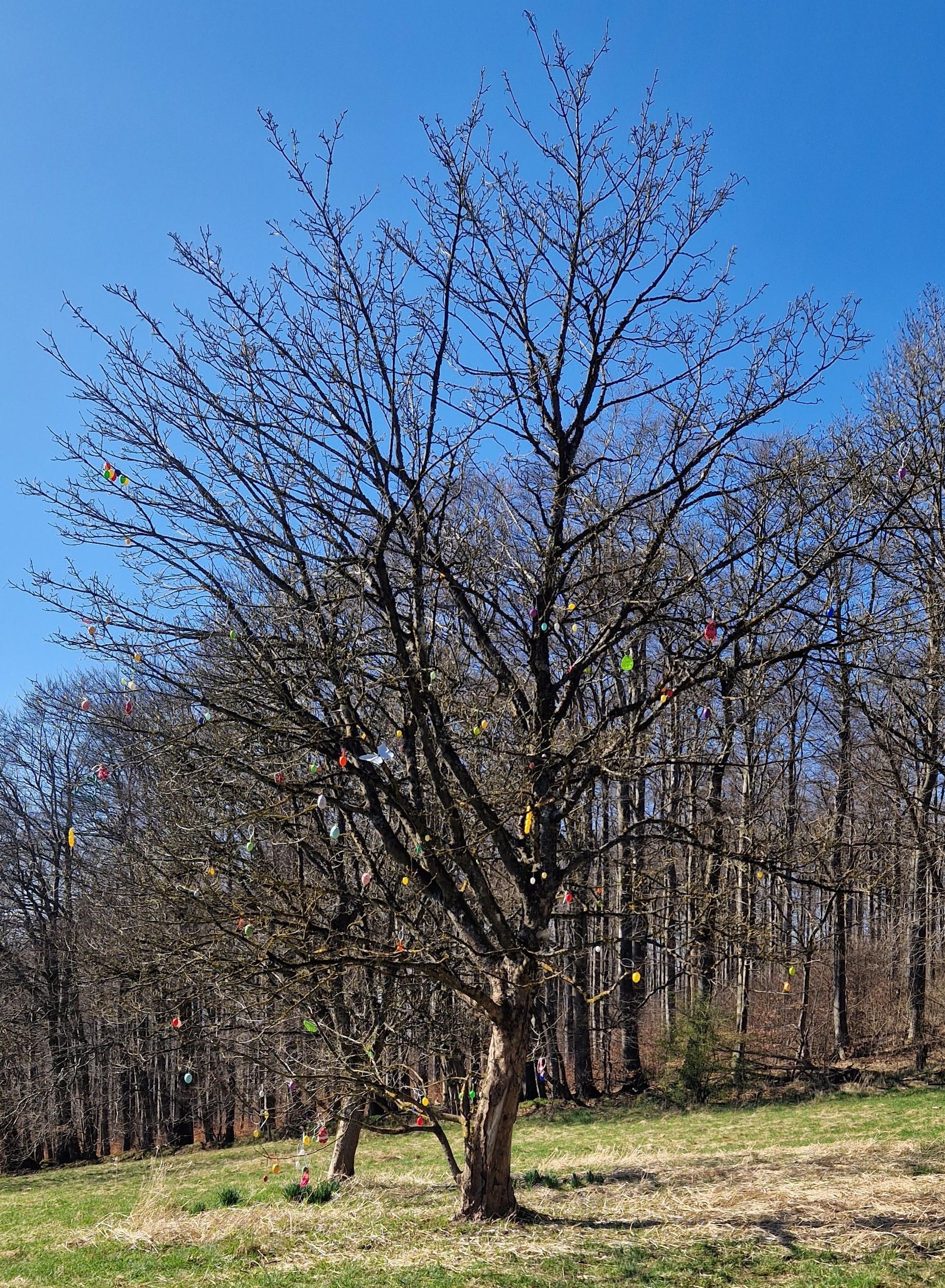 „Die Tradition, zu Ostern bemalte Eier an die Bäume zu hängen, entstand im deutschsprachigen Raum etwa in den 1960er Jahren. Eier galten schon in antiken Kulturen und Religionen als Zeichen der Fruchtbarkeit und Wiedergeburt und damit im Grunde als Sieg des Lebens über den Tod.