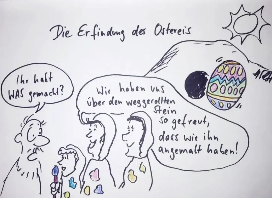 Ein Osterlachen – oder zumindest ein Osterlächeln – kann auch durch eine Karikatur ausgelöst werden, so wie die Karikatur in diesem Beitrag von Hannes Schott, Facebook.